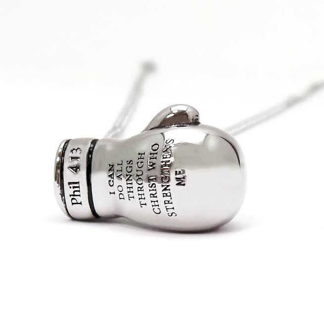 | <ボクシング・グローブ・ペンダント> ボクシング・グローブ型のキーホルダー 甲の部分には聖書の1節が刻まれています |